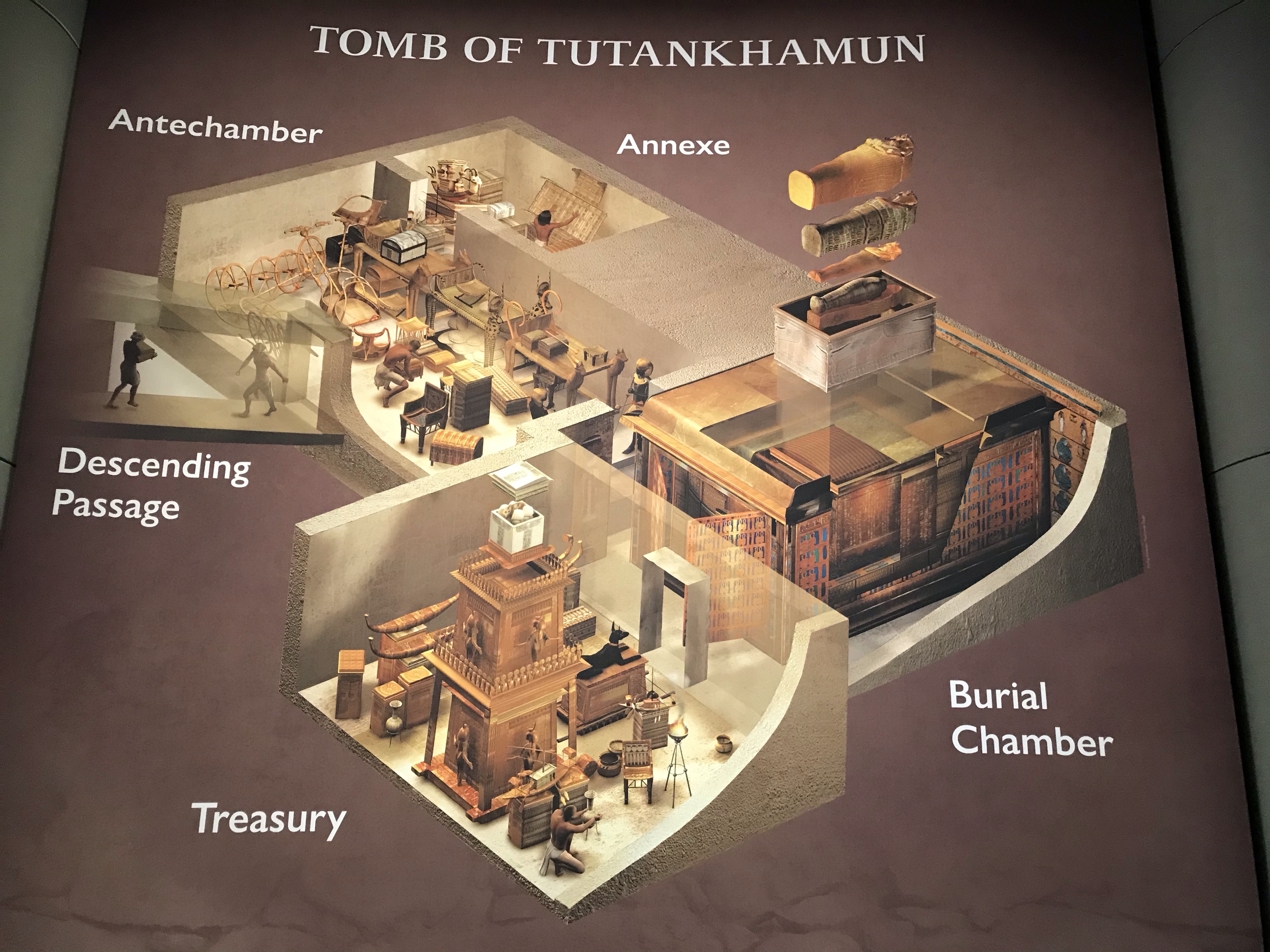 More exquisite artifacts show the high level of skill of artisans that produced wood, gold and stone carvings for the royal tomb. The layout of the tomb shows what Carter discovered in 1922. The pieces will be permanently installed in the museum in Egypt now under construction.