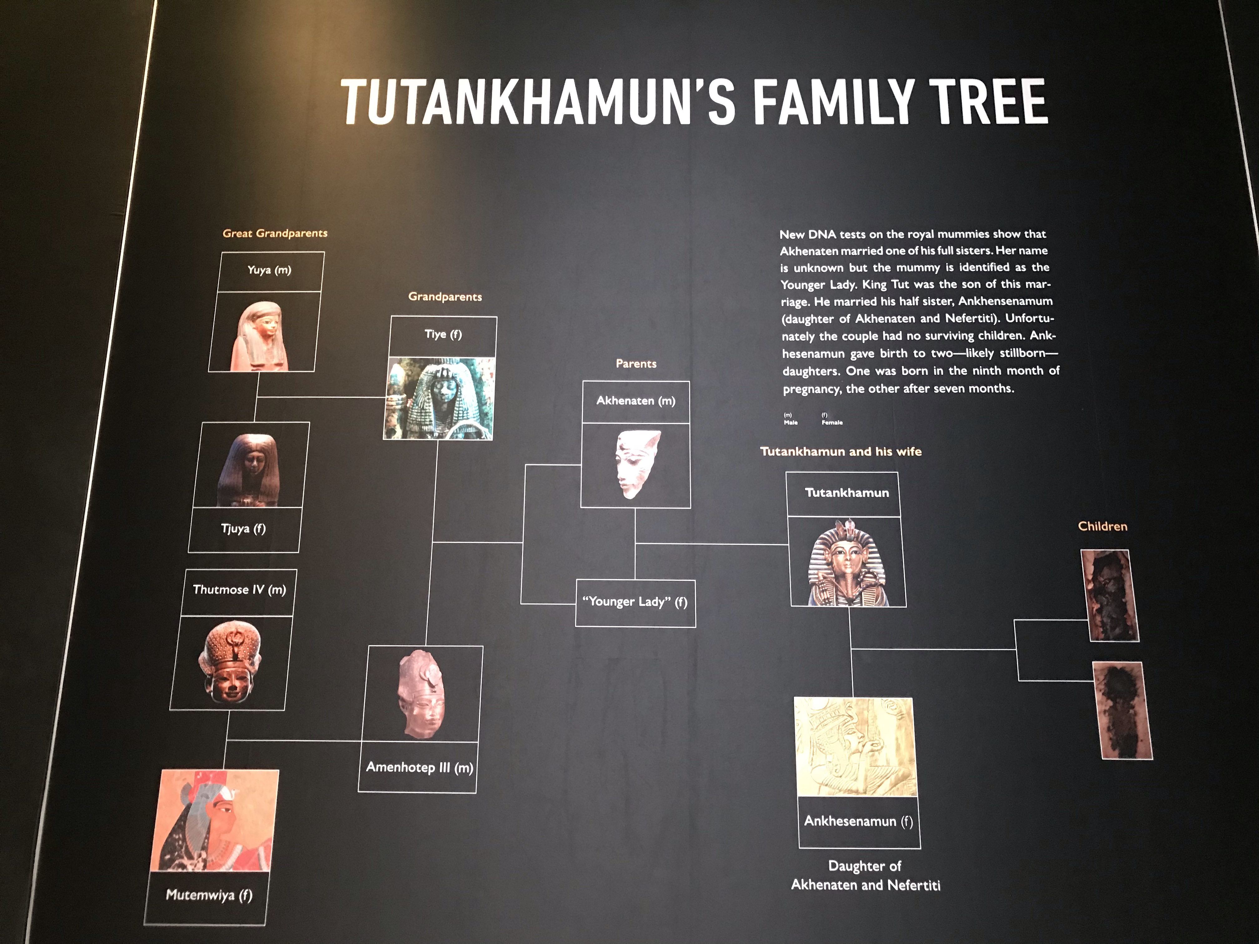 The treasures accompanying Tutankhamun’s mummy protected and assured his after life. The family tree traces his lineage from his father, Akhenaten, and grandfather Amenhotep. Both Tutankhamen and Akhenaten married their sisters, which may have contributed to multiple defects in the family. You can read about them here: https://en.m.wikipedia.org/wiki/Tutankhamun