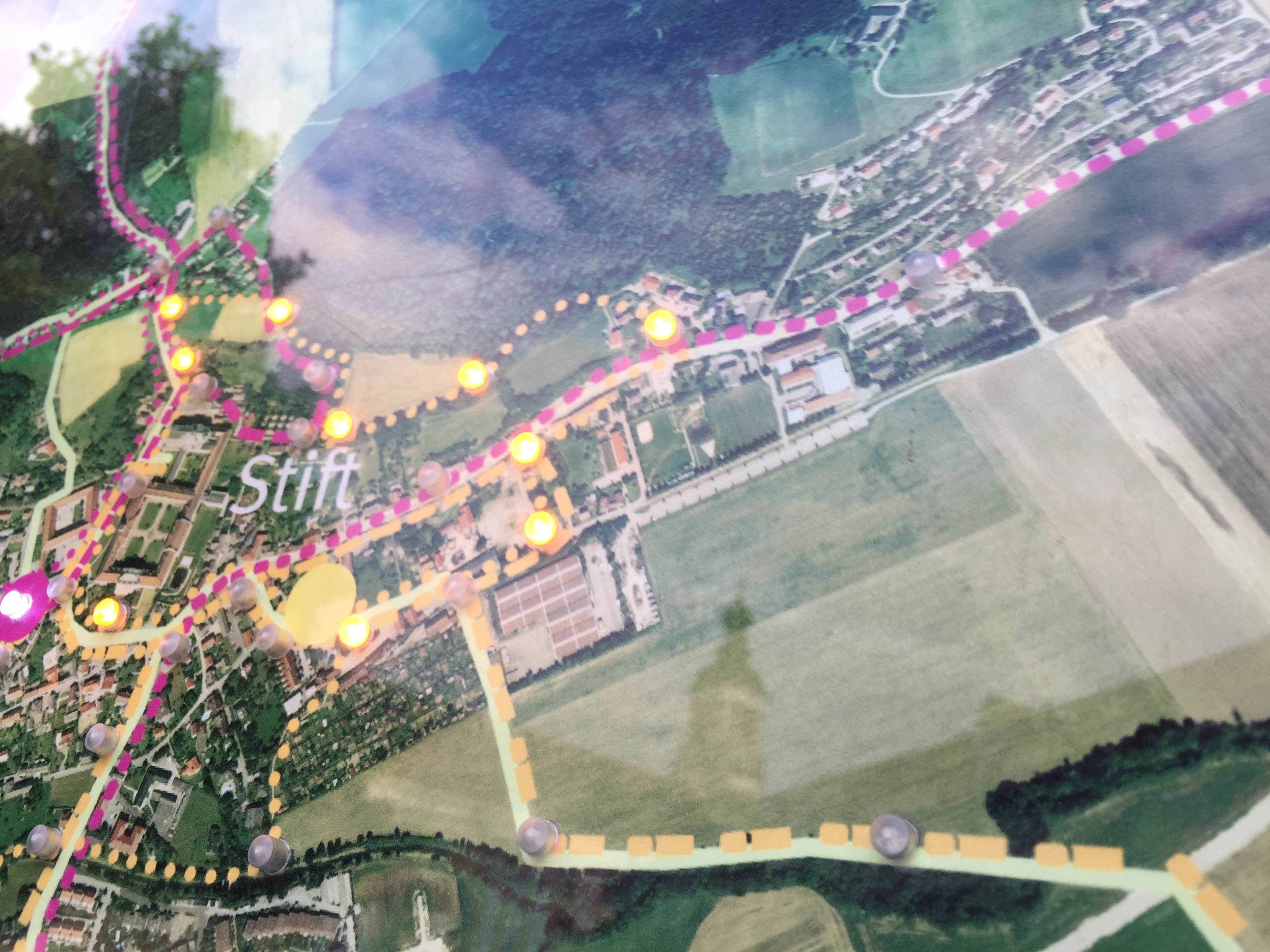A billboard advertising the Bruckner Way is located on a path outside the monastery. It lights up each path you select among several different paths. You can view the Google image below. “Wanderers” can choose from the more mild “running shoes” paths and those for more advanced “hikers”. Trips run any where from 5-20 km.
