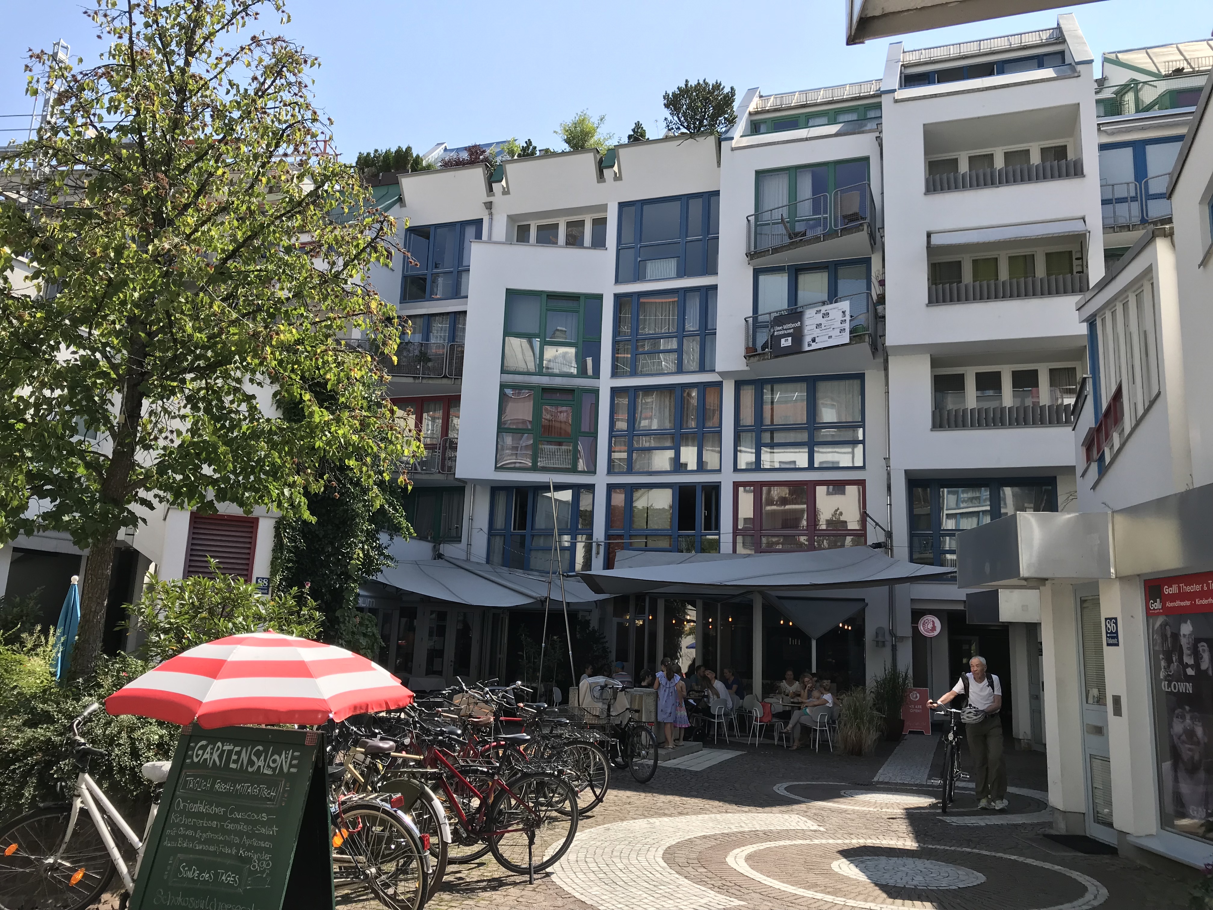 The Museum Quartier, tucked behind the Volks Theater, was an eye opener and inspiration for a visitor to this historic city. It’s alive with young people enjoying the balmy summer evening, amidst theater, dance, art, spontaneous outdoor performers, and of course, food establishments galore.