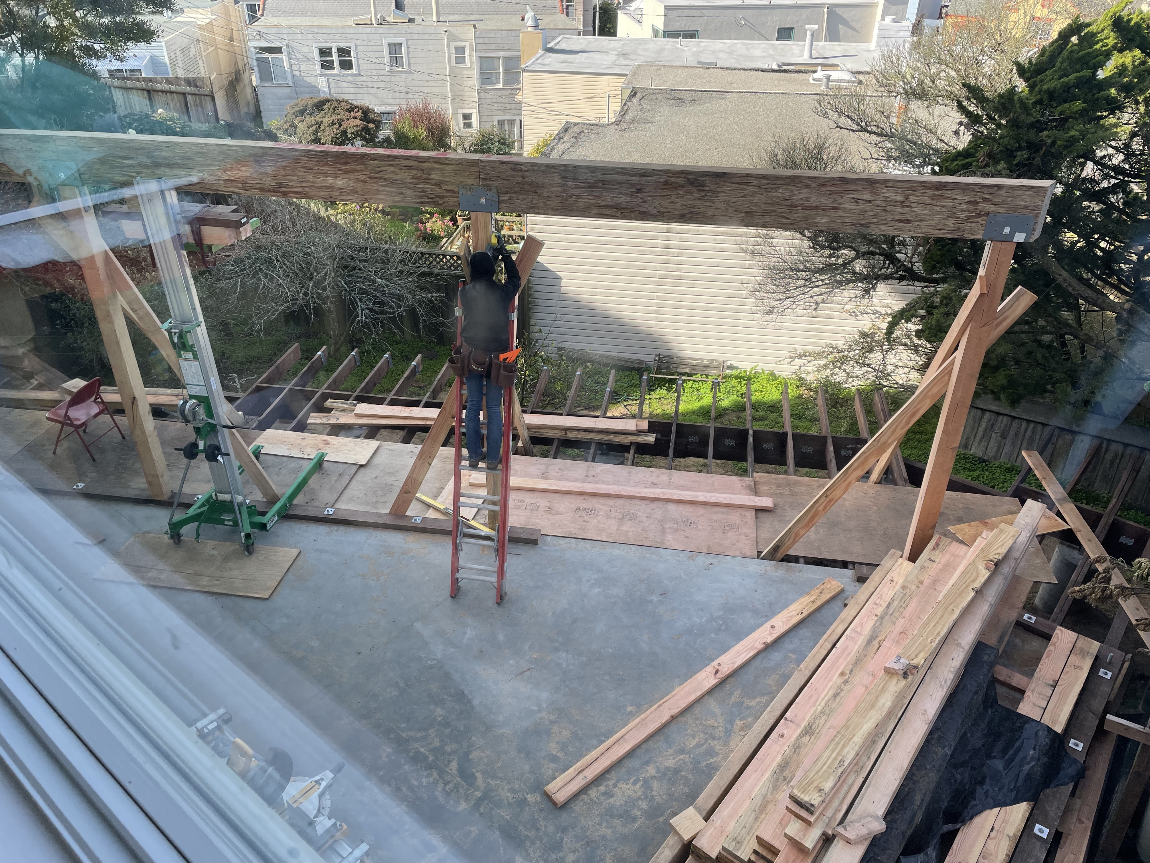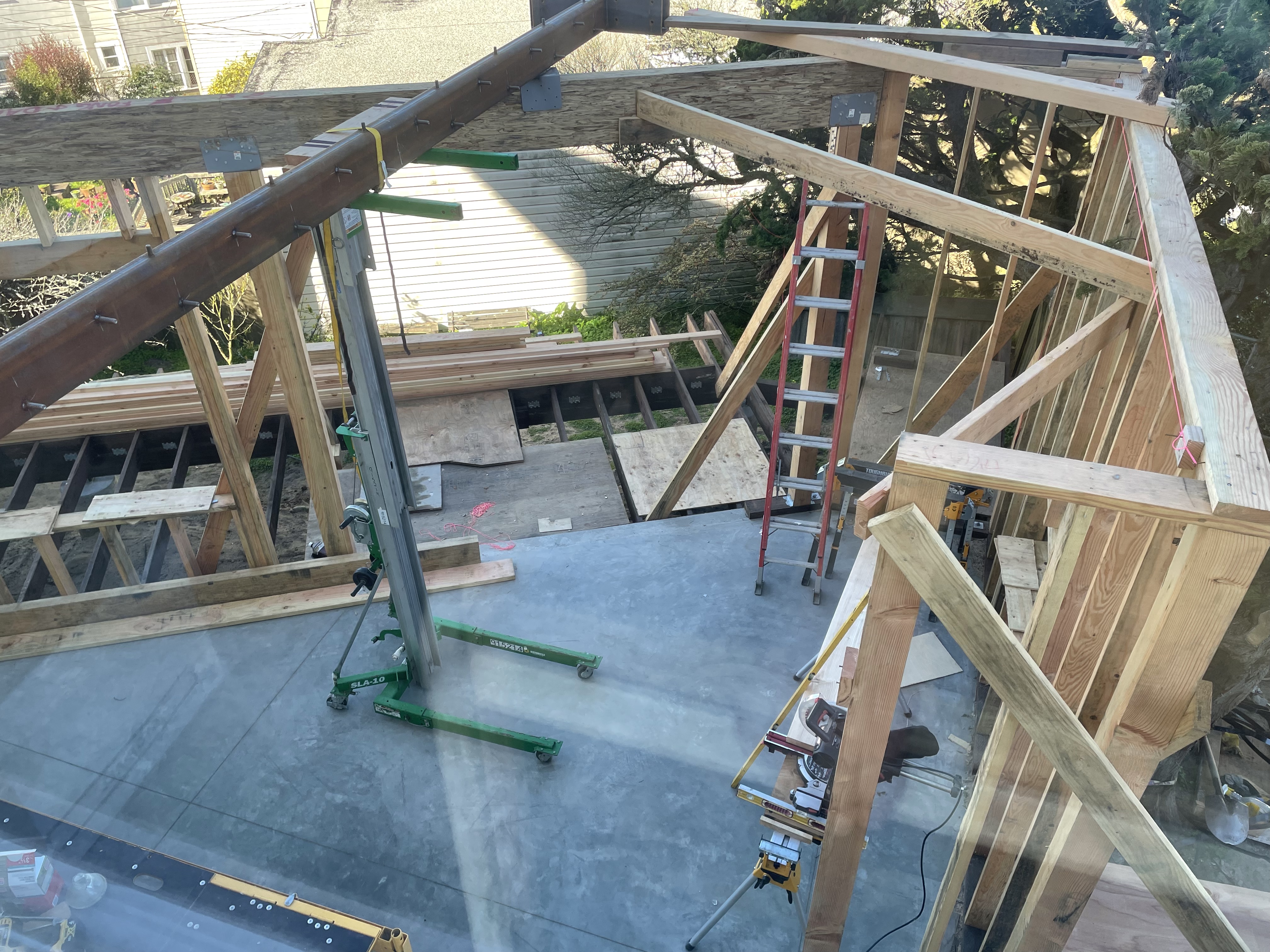 Still, more heavy construction work was ahead of us. Two steel beams arrived from the fabricator and stared us in the face: more calculating and logistics on how to erect these 800-lb gorillas. It took a few days to prepare the existing structure and get the necessary equipment to erect them safely.